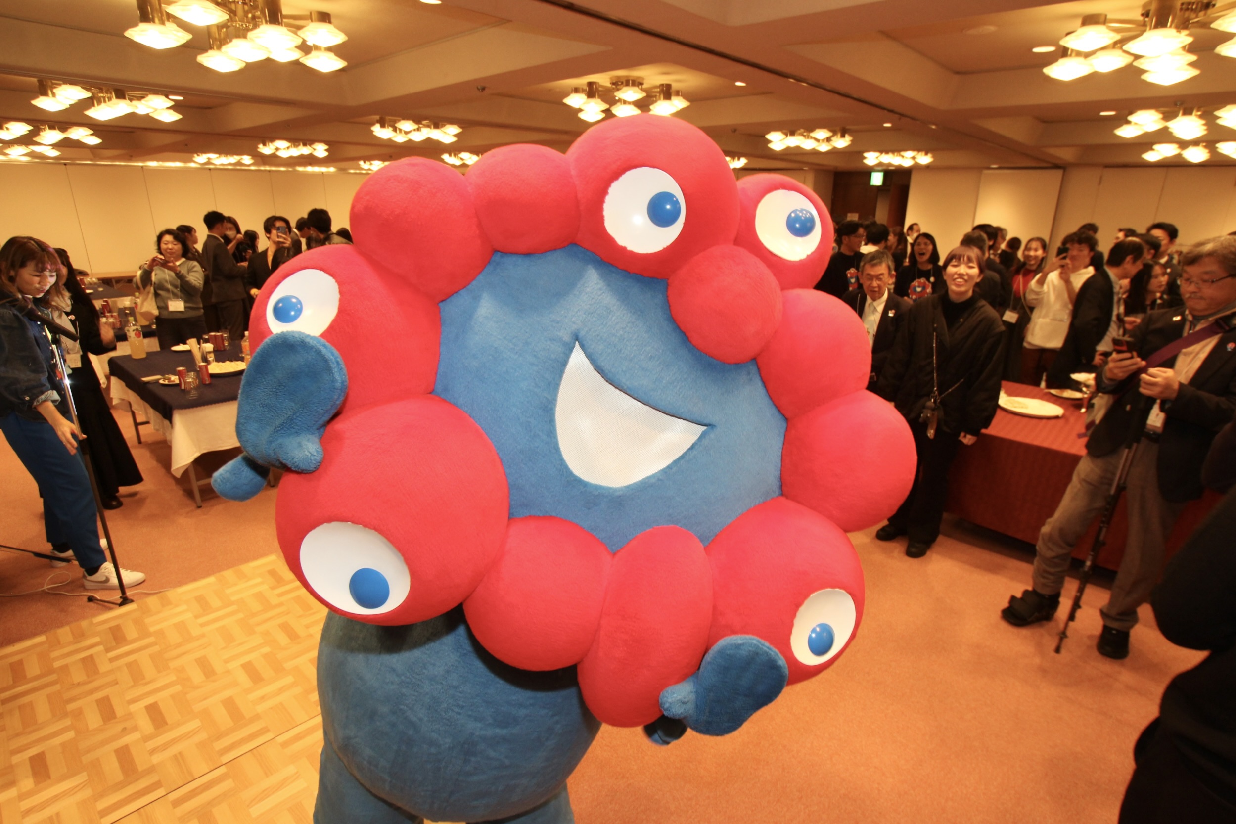 会場には万博の公式キャラクター「ミャクミャク」も登場し、催しに花を添えた。参加者は記念撮影などを楽しんだ。