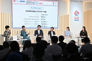 未来世代との対話コーナーでは、日経BANPAKUレポーターの京都大学の吉田健太さんと同志社大学の長野芽衣さんが登壇し、登壇者に質問した。「世界人口が増える中、カーボンニュートラル燃料の原料は食料と競合しないか」という長野さんの問いに、轟木氏が「わらや木材チップなど、食料と競合しないセルロース系廃棄物やふん尿から作る新燃料の開発が進んでいる」と解説した。吉田さんは、「再エネ由来のエネルギーで合成燃料を作るより、直接再エネとして使う方が効率がよいのでは」と質問。轟木氏は再エネ発電の地域差に言及し、「再エネを作る条件のよい地域から需要地に運ぶには、液体燃料のノウハウを生かせる合成燃料の形が適している」と答えた。